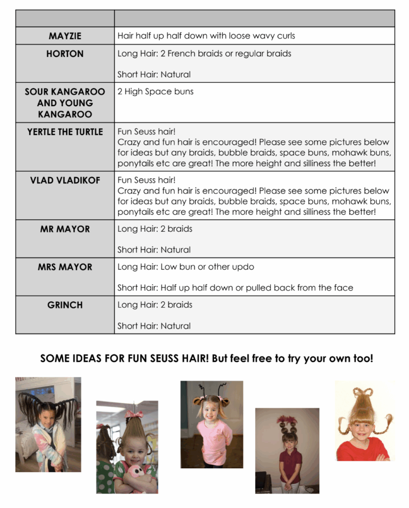 Last week I attached a “hair style” sheet for our shows. You are more than welcome to have your kiddo arrive at school with that hairstyle on Monday for Cast Photos. It would be a great practice.