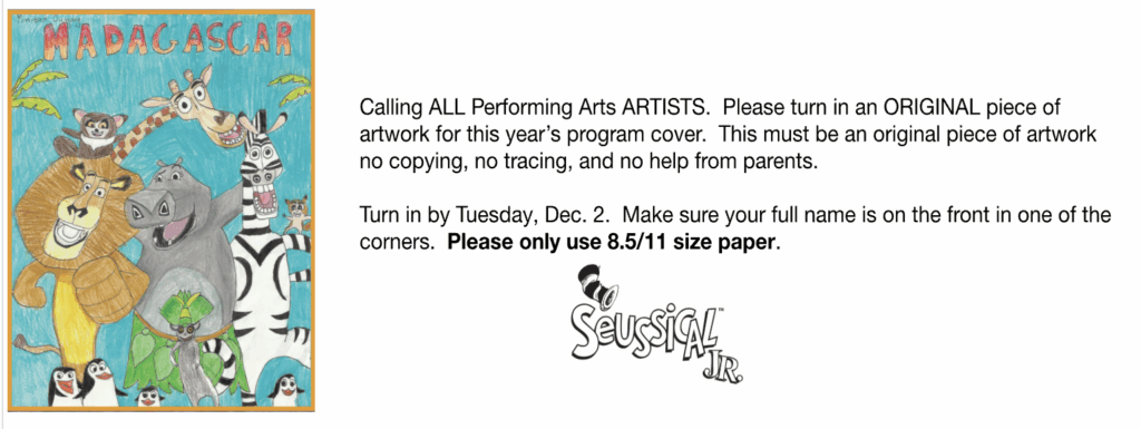 Performing Arts Actors: Please remember, registration closes on Dec. 2nd. Auditions start on Monday, Dec. 8th (this day is for learning and practicing). Everyone attends on Dec. 8th. Directors will teach the dance, song, and discuss the audition process. Below are the song lyrics and the dialogue to memorize (only pick one or two characters to audition for). The links below are for the song that will be sung at auditions. There are two links, one with lyrics and one without. If you do NOT want to sing or speak for the musical, that is ok, just let the directors know at the time of auditions.