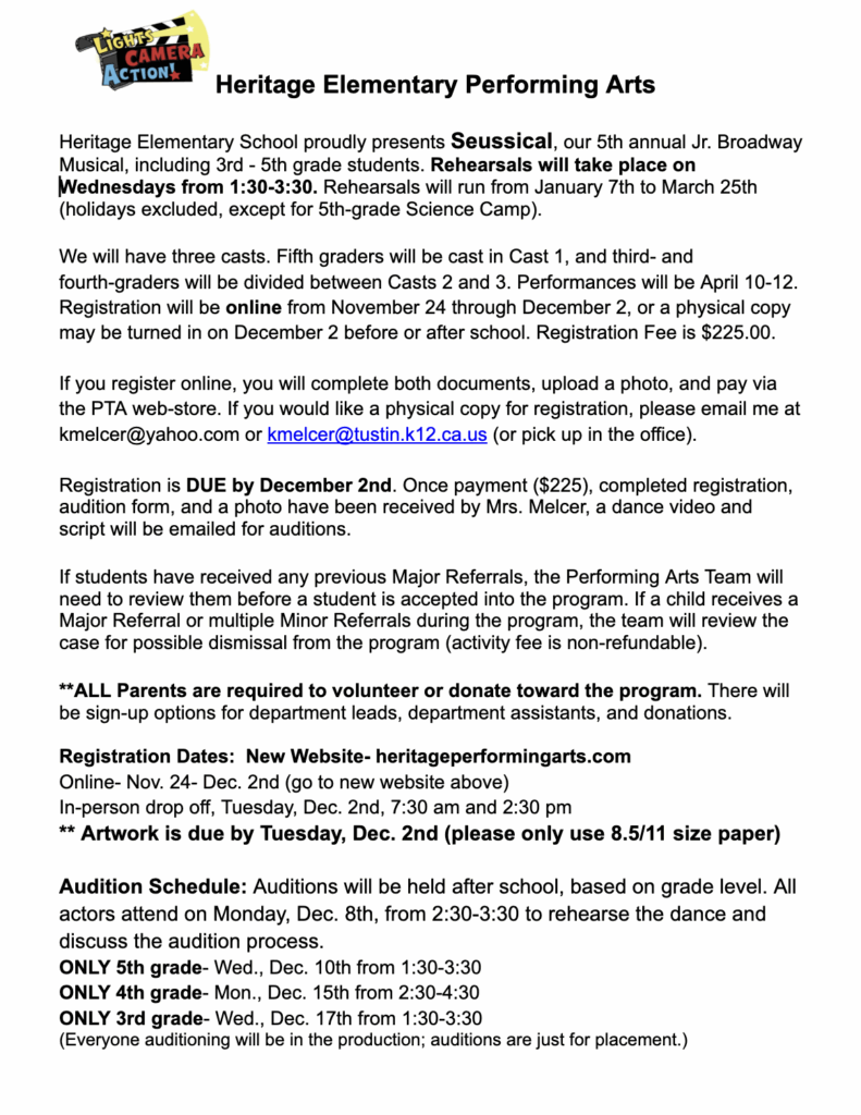 If you cannot attend your grade level’s audition day, you are allowed to attend one of the others. Please let me know ahead of time.